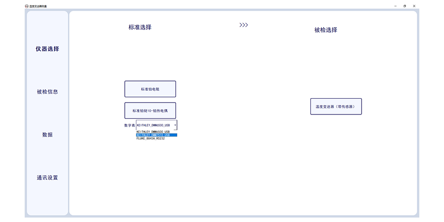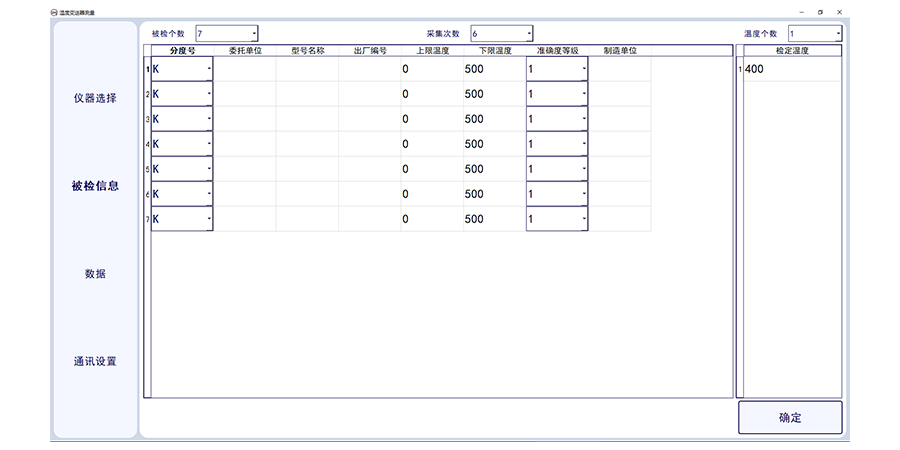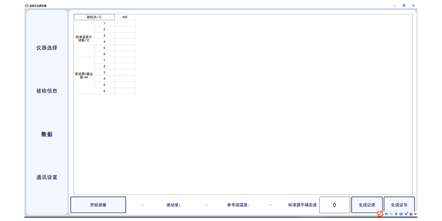 溫度變送器計量校準上位機軟件,此軟件適合溫度變送器的輸出電流采集,軟件需要溫度變送器(帶傳感器)配套標準器、恒溫設(shè)備及相應數(shù)字萬用表。軟件可選擇多個被檢傳感器,可設(shè)置采集次數(shù),及溫度個數(shù)及溫度點。軟件可輸入委托單位,型號名稱出廠編號及準確度等級及制造單位。