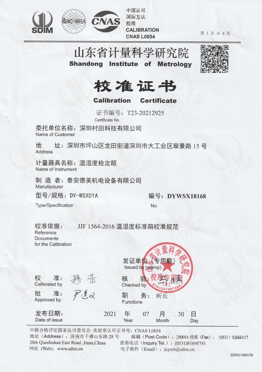深圳村田科技有限公司-溫濕度檢定箱
