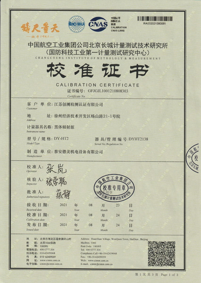 江蘇創(chuàng)測檢測認證有限公司-黑體輻射源 2021-9-1 本文被閱讀 19056 次