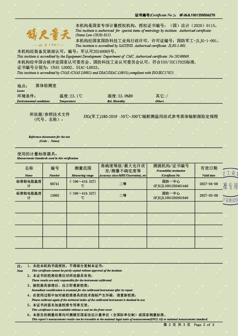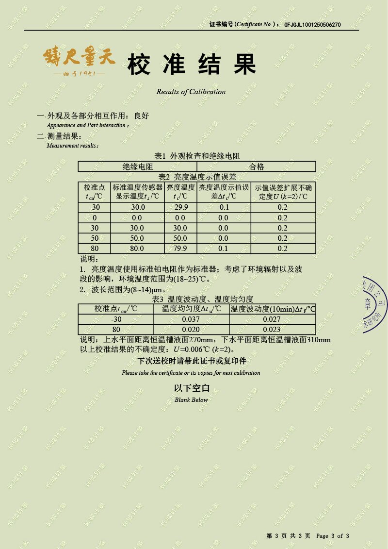| 上一條:面源黑體輻射源(50-500℃)校準(zhǔn)證書 | 下一條:高精度數(shù)字溫度計-校準(zhǔn)證書 |